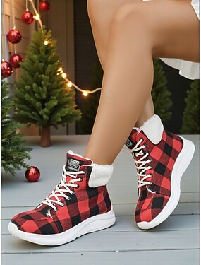 Botines navideños rojos de cuadros con cordones y detalles de piel sintética para mujer: zapatillas altas de invierno cómodas para ir de compras navideñas, fiestas de Navidad y paseos en clima frío.