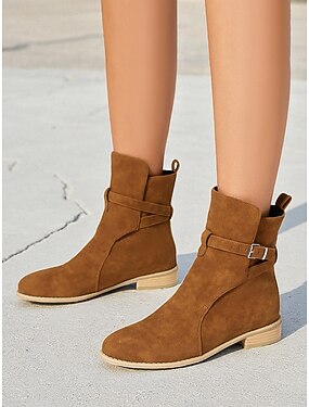 Botines marrón oscuro para mujer: botas planas informales clásicas con hebilla para looks de otoño, compras y uso diario.