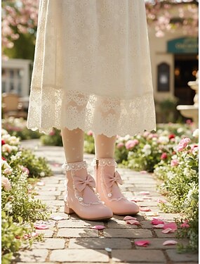 Botines blancos de mujer con detalle de perla y lazo, de inspiración vintage de los años 50, perfectos para looks diarios, lolita y elegantes.