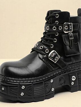 Botas de combate negras con remaches y hebilla para hombre: botines góticos con plataforma y cordones para conciertos, estilo motero y eventos punk.