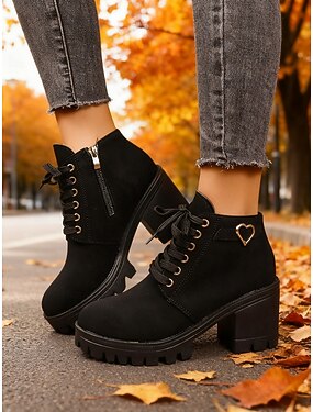 Botines de ante sintético color camel para mujer con cremallera lateral y detalle de encaje: botas cómodas de tacón cuadrado para uso informal en otoño.