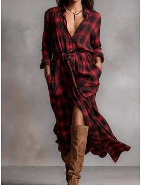 Mujer Vestido maxi Vestido informal Vestido de Columpio Vestido bohemio Casual Diario Ajuste regular Geométrico Manga 3/4 Cuello Camisero Rojo Gris Verano Primavera Otoño