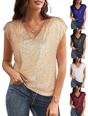 Mujer Blusa Tops con lentejuelas Lentejuelas Plano Elegante Clásico Moderno Manga Corta Escote en Pico Tops regulares Diario Festivos Noche Negro Blanco Vino Azul Real Dorado Verano Primavera