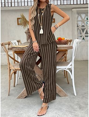 Mujer Chándal Conjuntos de pantalones Sin Mangas Escote Redondo A Rayas Estampado Moda Ropa de calle Casual Diario Exterior Marrón Verano Holgado