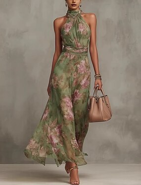 Mujer Vestido maxi Vestido de raso Elegante Diario Exterior Ajuste regular Floral Sin Mangas Cuello halter Verde Trébol Primavera