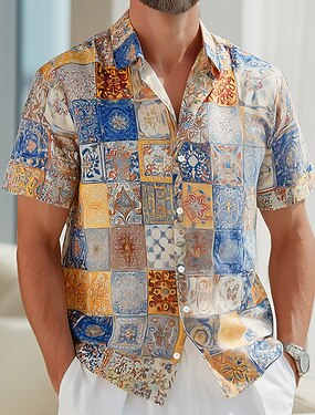 Hombre Boho Estampado de azulejos mediterráneos Mosaico marroquí Camisa Abotonar la camisa Manga Corta retro de la vendimia Ropa de calle Vacaciones Verano Primavera Cuello Vuelto Impresión 3D