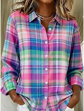 Mujer Camisa Botones Estampado Graphic Plaid Vintage Elegante Moderno Manga Larga Cuello Camisero Tops regulares Diario Azul Piscina Amarillo Morado Naranja Verde Trébol Verano Primavera
