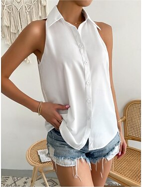 Mujer Camisa de raso Camisa de campamento Frunce Color sólido Elegante Casual Sin Mangas Cuello Camisero Tops regulares Diario Negro Blanco Morado Naranja Verde Trébol Verano Primavera