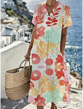 Mujer Vestido Midi Vestido de verano Vacaciones Casual Estilo playero Playa Holgado Floral Graphic Manga Corta Escote en Pico Beige Rosa Brillante Verano Primavera