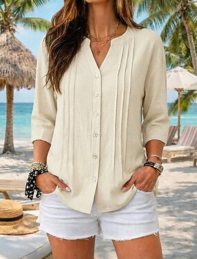 Mujer Blusa Lino de algodón sintético Botones Color sólido Plano Elegante Casual Manga 3/4 Escote en Pico Tops largos Diario Blanco Verde Claro Azul Marino Marrón Albaricoque Verano Primavera Otoño
