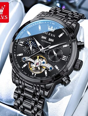 Reloj automático de lujo para hombre Olevs, modelo esqueleto mecánico, con fase lunar, caja de acero inoxidable, resistente al agua y con iluminación LED.