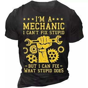 Camiseta divertida para hombres mecánicos con la frase 'No puedo arreglar lo estúpido pero puedo arreglar lo que lo estúpido hace' | Camiseta gráfica de humor de trabajo de manga corta negra