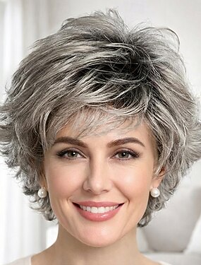 Peluca corta elegante para mujer: elegante corte bob en capas plateadas.