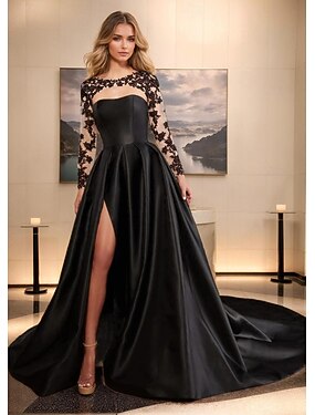 Vestido de Gala Corte A Cola de Capilla Trajes de gala Vestidos de noche Corte Cenicienta Vestimenta formal Elegante Estilo de Celebridad Sin Mangas Hombros Caídos Fiesta de jardin Boda Encaje Satén