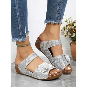 Sandalias de cuña con purpurina para mujer: zapatos con lentejuelas plateadas y detalles florales para fiestas de verano, salidas informales y ropa de resort.