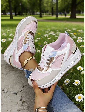 Zapatillas de plataforma con cuña rosas para mujer: zapatillas informales con suela acolchada, zapatillas de moda con cordones para mujer, uso diario, caminatas, viajes, compras y actividades informales al aire libre.
