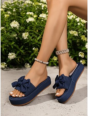 Sandalias de plataforma con lazo de mezclilla para mujer, diseño moderno de punta abierta para vacaciones, paseos por la playa, compras y ropa informal de verano.