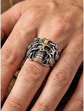 Anillo de acero inoxidable con calavera gótica para hombre, anillo llamativo estilo motero punk de varios tamaños con detalle floral, joyería de moda atrevida para uso casual, viajes, vacaciones y estilo Halloween.