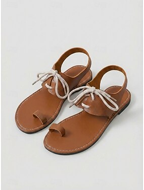 Sandalias marrones de mujer con tira entre los dedos y detalle de encaje: sandalias planas minimalistas, calzado ligero de verano para vacaciones, playa y viajes. &uso diario