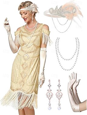 Conjunto Rugido 20s 1920s Hasta la Rodilla Vestidos Vestido Flapper Accesorios con accesorios Hombro frío El gran Gatsby Invitado a la boda Lentejuelas Borlas Escote en Pico Disfraz Mujer Fiesta de