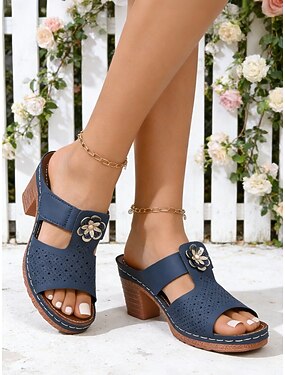Sandalias de tacón cuadrado transpirables azul marino para mujer con detalle floral: zapatos de tacón abierto casuales y cómodos para el trabajo, la oficina, viajes, compras &uso diario