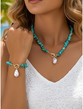 Conjunto de collar y pulsera para mujer, perla de imitación con cuentas turquesas, multicolor, joyería de estilo boho, perfecto para vacaciones, viajes, uso diario y atuendos casuales.