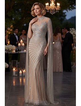 Corte Trompeta Sirena Cola de Corte Bordado con cuentas Vestido formal Vestido de madre de la novia Vestido de gala con capa Reluciente Estilo de Celebridad Lentejuelas Sin Mangas Cuello Barco Fiesta