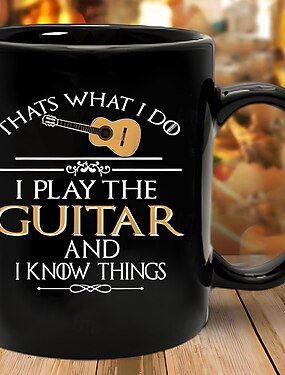 Taza de regalo divertida "Eso es lo que hago, toco la guitarra y sé cosas", taza de café de cerámica negra, divertida taza para amantes de la música, regalo para guitarristas, músicos, miembros de