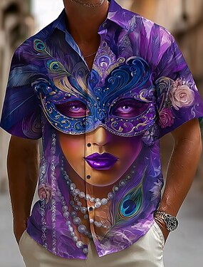 Mardi Gras Hombre Carnaval Cuentas Máscara con plumas Camisa Abotonar la camisa Manga Corta retro de la vendimia Fiesta Festivos Verano Primavera Cuello Vuelto Impresión 3D camisas con cuello Morado