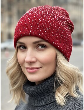 Gorro de punto de poliéster para mujer, decoración de diamantes de imitación, disponible en varios colores, perfecto para la moda de invierno.