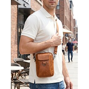 Bolso bandolera de piel marrón para hombre con múltiples bolsillos con cremallera y correa ajustable, bolso de hombro pequeño vintage para viajes, trabajo y uso diario.