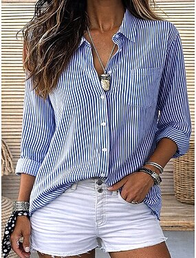 Mujer Camiseta Estampado Graphic Geométrico A Rayas Vintage Elegante Clásico Manga Corta Cuello Barco Tops regulares Diario Azul Piscina Negro Blanco Azul Real Morado Verano Primavera