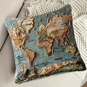 Funda de cojín vintage con mapa del mundo, diseño plano 2D a una cara, que representa un antiguo mapa de exploración mundial. Funda decorativa para sofá o decoración del hogar.