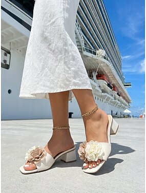 Mules de tacón cuadrado con estampado floral 3D blanco para mujer, con puntera cuadrada: elegantes sandalias tipo chancla para vacaciones tropicales, playas y veladas de verano.