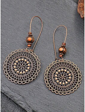 Pendientes colgantes redondos de aleación y madera para mujer, diseño de mandala bohemio vintage, estilo ligero y llamativo, perfectos para uso diario informal, vacaciones en la playa y atuendos de verano.