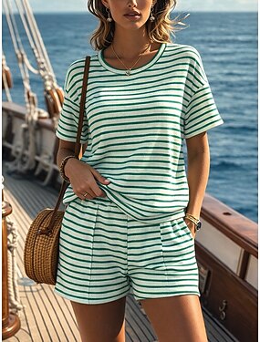 Mujer Conjuntos de pantalones cortos Manga Corta Escote Redondo A Rayas Estampado Moda Ropa de calle Casual Diario Exterior Verde Trébol Verano Ajuste regular