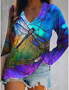 Mujer Camiseta Estampado Graphic Gato Libélula Elegante Bohemia Vintage Manga Larga Escote en Pico Tops regulares Diario Noche Fin de semana Azul Piscina Negro y blanco Negro Amarillo Verde Oscuro