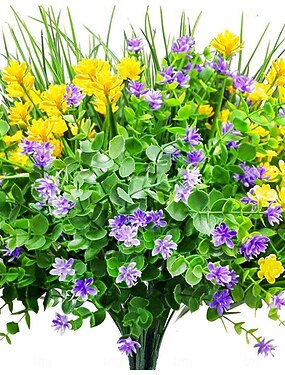 9 paquetes de flores artificiales para exteriores, eucalipto artificial y vegetación de césped primaveral, plantas de plástico resistentes a los rayos UV para decoración interior o exterior, hogar,