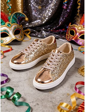 Zapatillas brillantes doradas con glitter para el Mardi Gras con punta metálica - Zapatos planos con cordones para carnaval Nochevieja y glamour casual