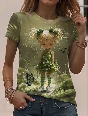 Mujer Camiseta Estampado Graphic Animal Vintage Elegante Clásico Manga Corta Cuello Barco Escote Redondo Tops regulares Diario Fin de semana Verde Claro Verde Trébol Arco Iris Verano Primavera