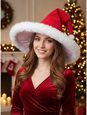 Gorro de mago navideño para mujer con ribete de pelo y pompón, estilo festivo de Papá Noel para fiestas navideñas y celebraciones invernales.