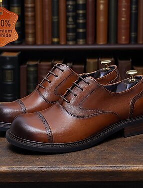 Zapatos de vestir Oxford de cuero genuino con punta de gorra para hombre: primera capa de piel de vaca, zapatos formales con cordones, zapatos de negocios clásicos para oficina, bodas y atuendo