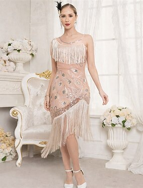 Rugido 20s 1920s Mini Vestidos Vestido Flapper Sin Mangas El gran Gatsby Invitado a la boda Lentejuelas Borlas Escote en Pico Disfraz Mujer Mascarada Carnaval Fiesta de Noche Boda Adulto Vestido