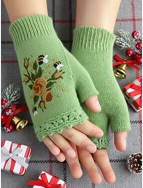 Guantes bordados navideños para mujer: diseño floral con abejas, material de hilo de algodón, disponible en varios colores, perfectos para las vacaciones de invierno y ocasiones festivas.