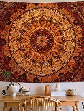Tapiz de pared bohemio con mandala naranja quemado, intrincado medallón floral, decoración de pared vintage, arte étnico tribal, decoración para el hogar, sala de estar, oficina, fondo