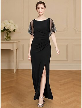 Funda Columna Hasta el Suelo Vestido negro Vestido Invitada Boda Vestido formal Vestido de Madrina Manga Corta Cuello Barco Elegante Vintage Sencillo Formal Noche formal Semi-formal Encaje con