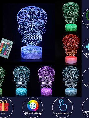 Lámpara de ilusión de luz nocturna 3d de calavera decoración de regalo de halloween para niños cambio de 16 colores con decoración de habitación con control remoto