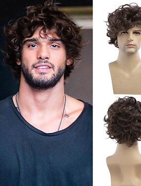Peluca rizada para hombre, peluca corta en capas de color marrón, peluca sintética para cosplay de Halloween
