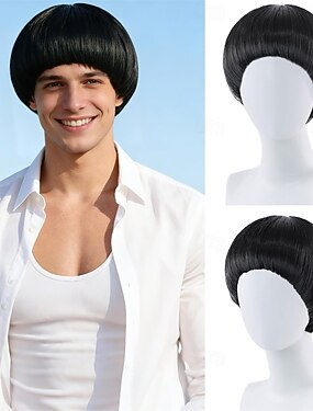 Peluca negra de champiñón para hombre y mujer, disfraz, peluca corta negra de corte tazón con flequillo para fiestas diarias, Halloween, cosplay y anime.