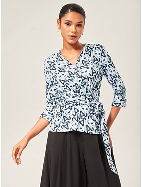 Mujer Camisa casual Geométrico Casual Obispo Azul Piscina corbata frontal Manga 3/4 Elegante Vacaciones Escote en Pico Verano Otoño Temporadas Cruzadas
